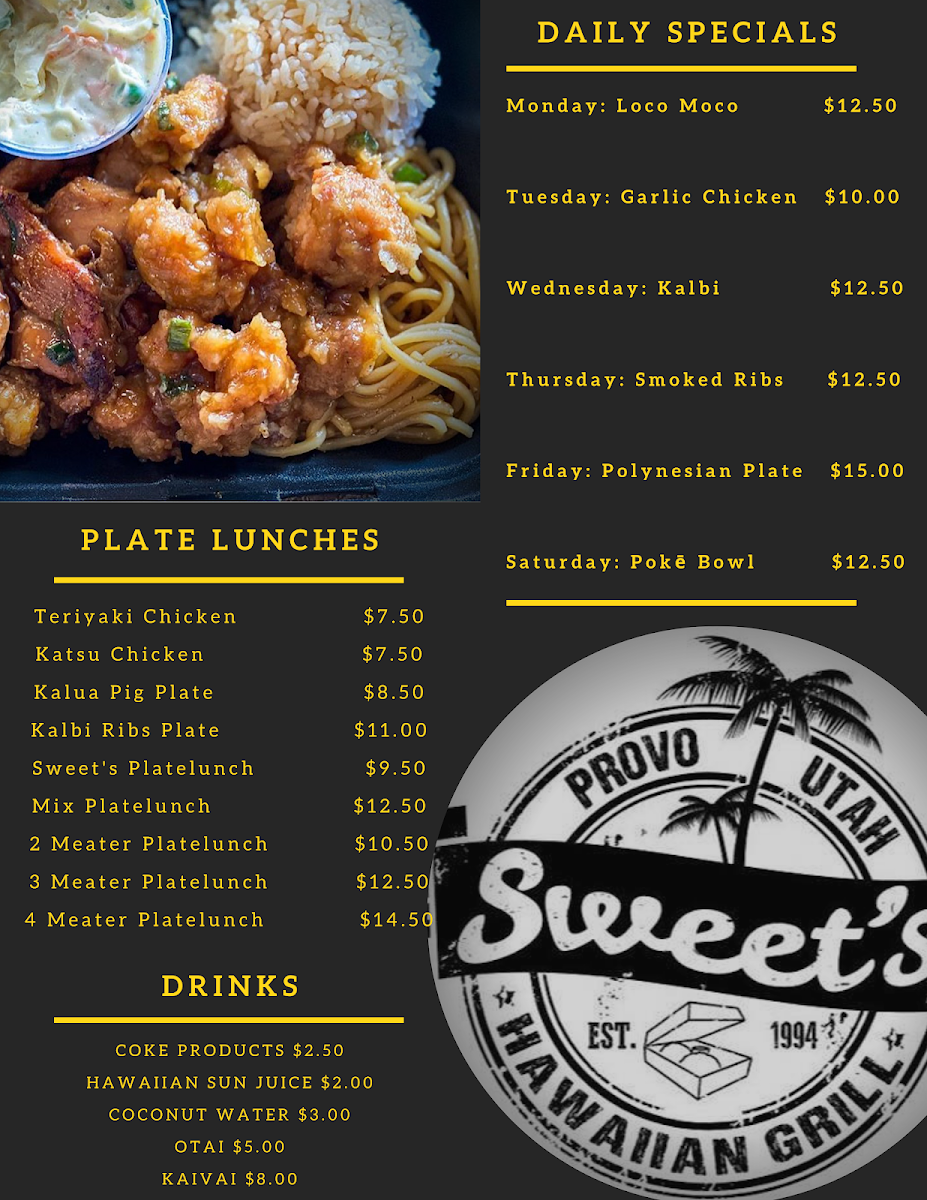 Welcome to Sweet's Island Place, a culinary gem nestled at 711 Columbia Ln in Provo, UT. Celebrated for its authentic Polynesian fare, this family-owned eatery invites you to savor a menu brimming with traditional flavors. Start with a Spam Musubi for just $4, or delve into various sides like Kalua Pig or Teriyaki Chicken, all priced affordably at $6.